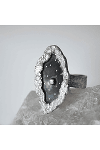MATERIALIDAD: Hecho completamente de plata 950. Su centro está más hundido y deja una "boveda" de cielo nocturno, que trabajé con plata patinada negra. En ella grabé algunas estrellas y en su centro una bola de plata brillante, representa la Luna llena. Sus bordes son irregulares y trabajados con la técnica de reticulación, donde a través del fuego fuí deformando la superficie del metal para acentuar el contraste con el centro oscuro.