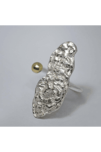MATERIALIDAD: Este anillo es una pieza única, lo que quiere decir es que no tienen otro igual. Es un fragmento de plata 950 fundida artesanalmente sobre carbón, y con texturas en su superficie . Tiene también una bola de oro 18 k en el otro extremo del cuerpo del anillo, que queda como un punto de luz dorada en contraste con la irregularidad e imperfección de la plata .