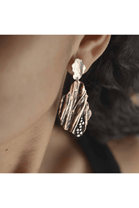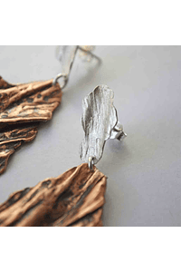 MATERIALIDAD: Estos aros están hechos de cobre plegado y texturado con el pulso de las manos y el martillo . La parte superior está hecha de plata 950 texturada con martillo y con bordes irregulares, con tornillo de plata también.
