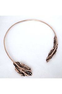 MATERIALIDAD: Este collar está hecho de cobre plegado y texturado con el pulso de las manos y el martillo . Tiene unas bolas de plata 950 en uno de sus extremos, y el alambre grueso de cobre que se adapta a tu cuello es firme y a la vez regulable, para que se adapte a las formas de tu cuerpo.