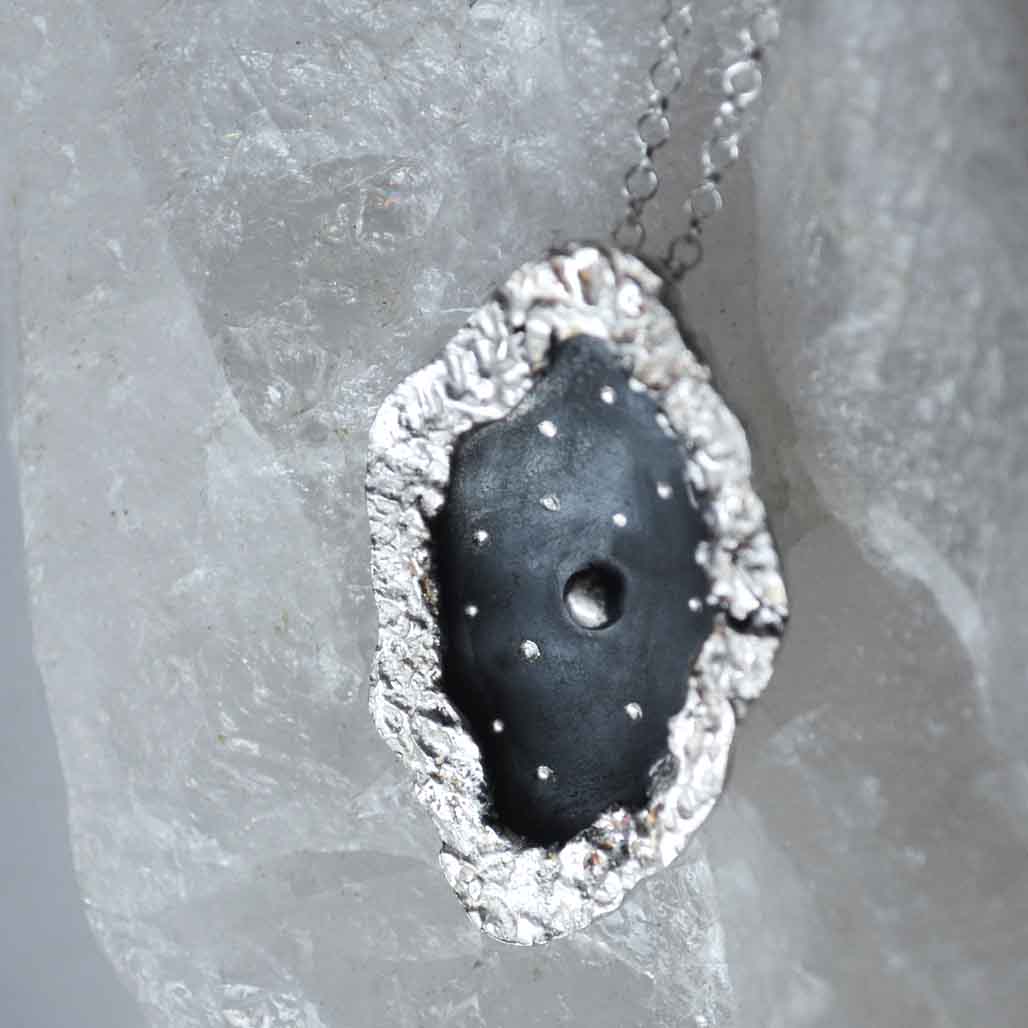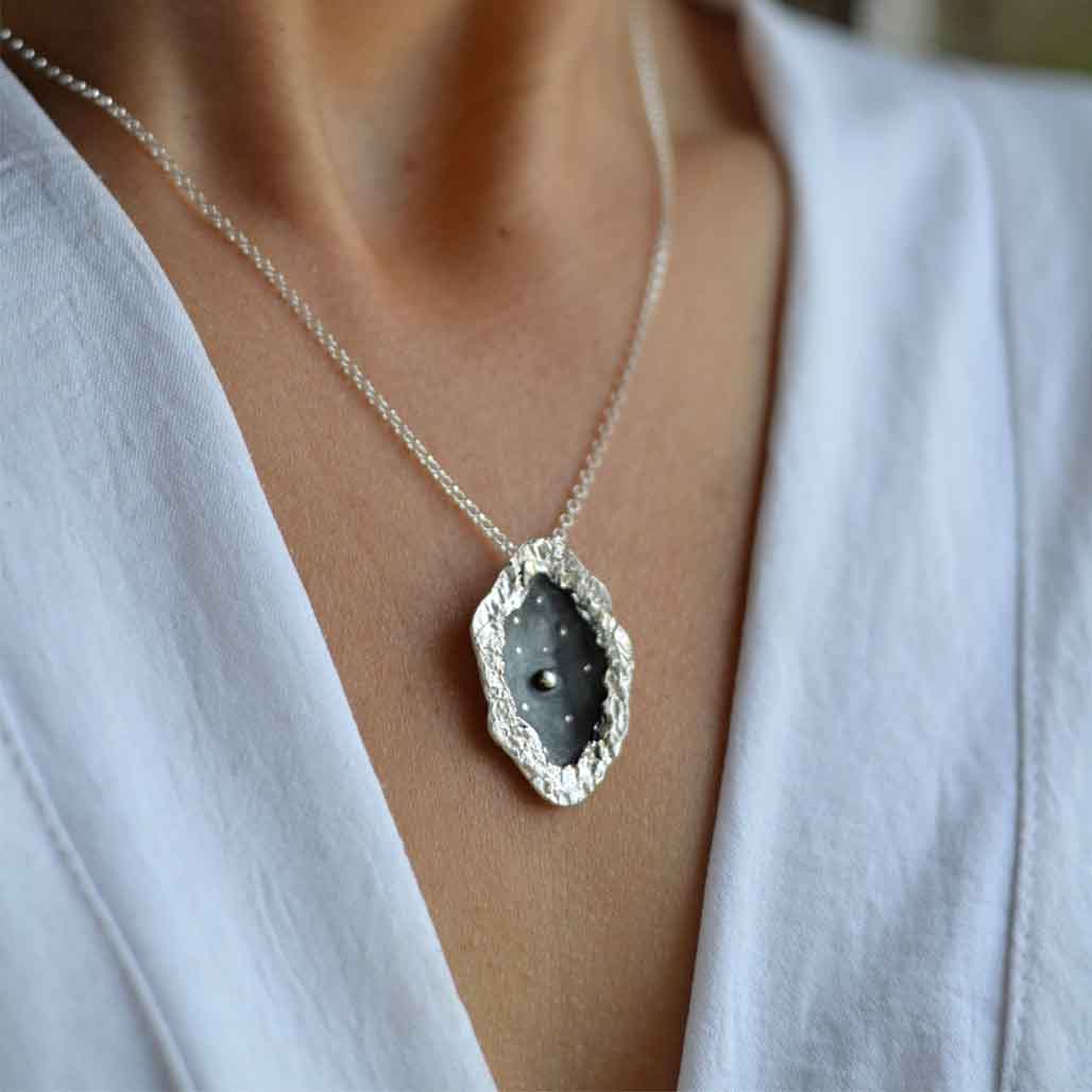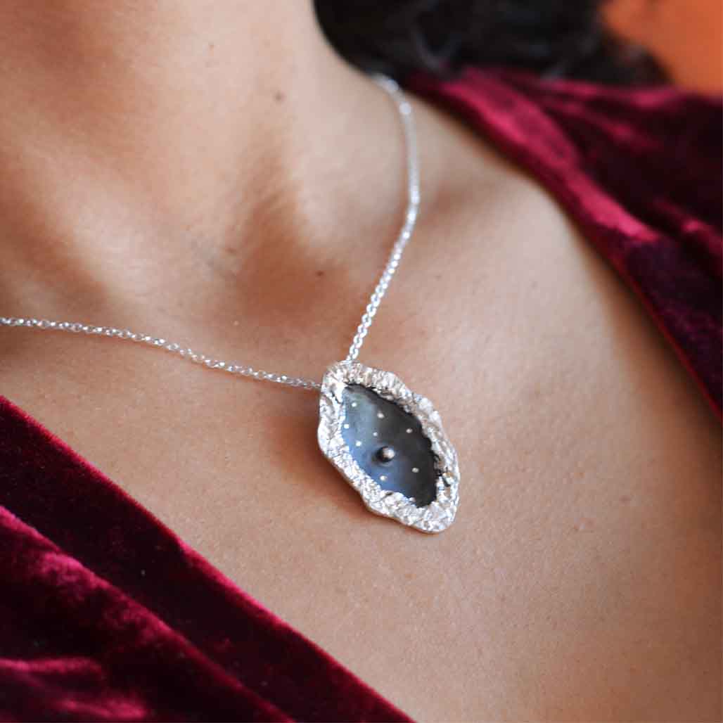 MATERIALIDAD: Este collar está hecho completamente de plata 950. Su centro está más hundido y deja una "boveda" de cielo nocturno, que trabaje con plata patinada negra. En ella grabé algunas estrellas y en su centro una bola de plata representa la Luna llena. Sus bordes son irregulares y trabajados con la técnica de reticulación, donde a través del fuego fuí deformando la superficie del metal para acentuar el contraste con el centro oscuro.