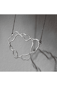 Este collar es una PIEZA ÚNICA de formas irregulares, sinuosas y ligeras , guarda el impulso libre de la mano, el instante del movimiento, la huella de un gesto que se vuelve joya. Como si fueran líneas dibujadas en el viento, pero con metal que las hace eternas. Para que lleves sobre tu pecho unos trazos de plata que se entraman en sus formas con tu piel.